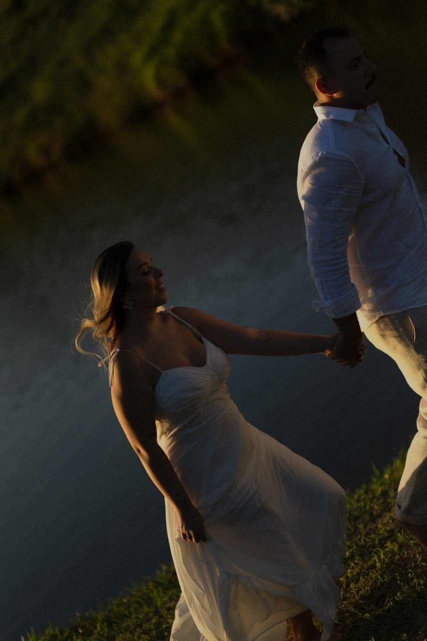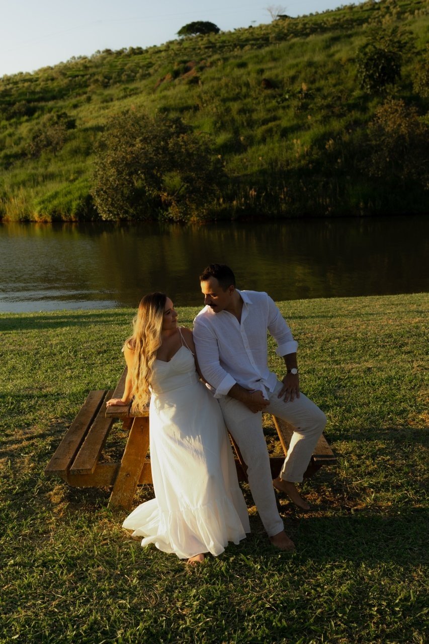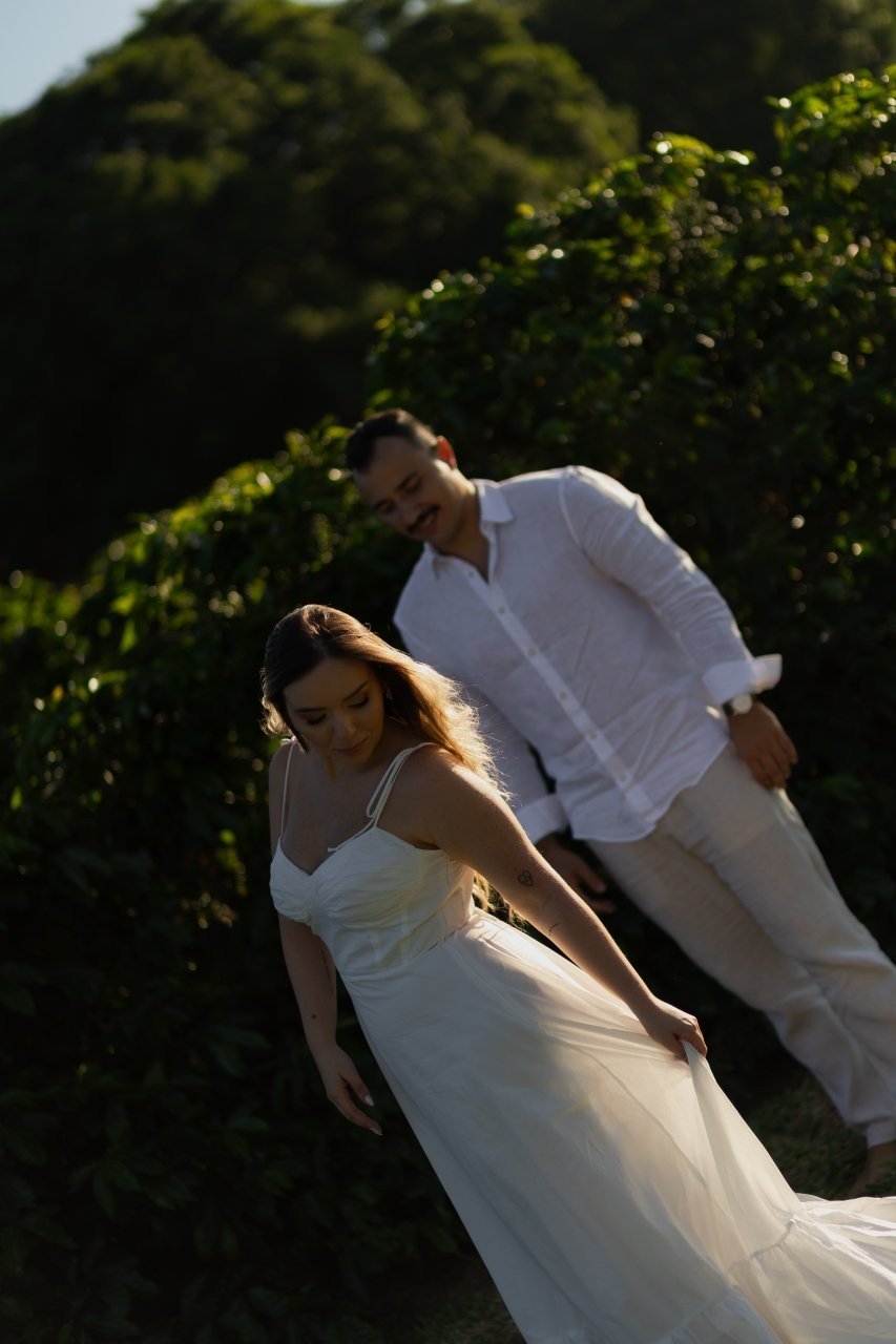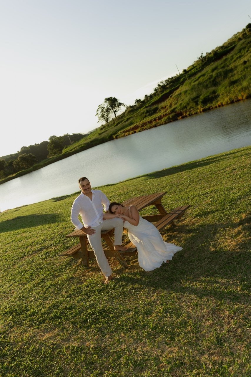 Desde então, não nos desgrudamos mais. Três meses depois, já estávamos morando juntos. E quando completávamos quase dois anos, veio o pedido: em São Miguel dos Milagres, no dia 12/06/2024. Ele estava visivelmente nervoso (mal conseguia disfarçar). No nosso chalé, em meio à natureza, abri a porta e me deparei com flores, fotos nossas e um cenário de tirar o fôlego. Quando virei para trás, lá estava ele, ajoelhado, com a voz trêmula e os olhos brilhando, me pedindo em casamento. Só conseguia rir — de alegria, de emoção, de amor. Dizer "sim" nunca pareceu tão natural.